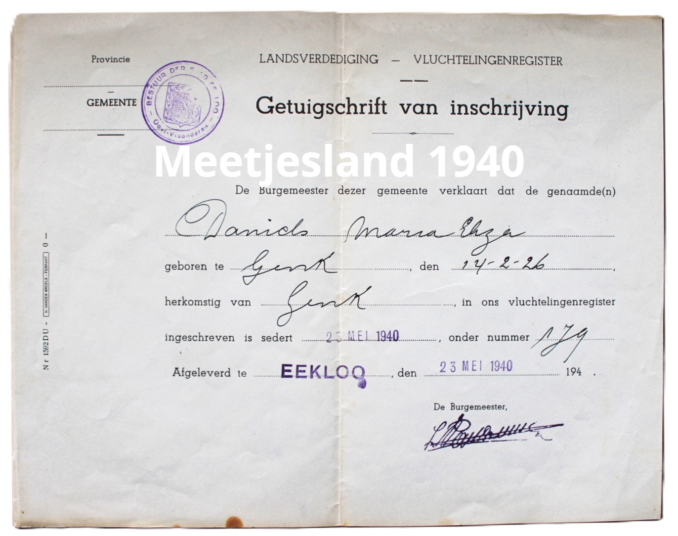 Ingeschreven als vluchteling te Eeklo op 23.05.1940, een dag voordat de Duitsers de stad innamen.